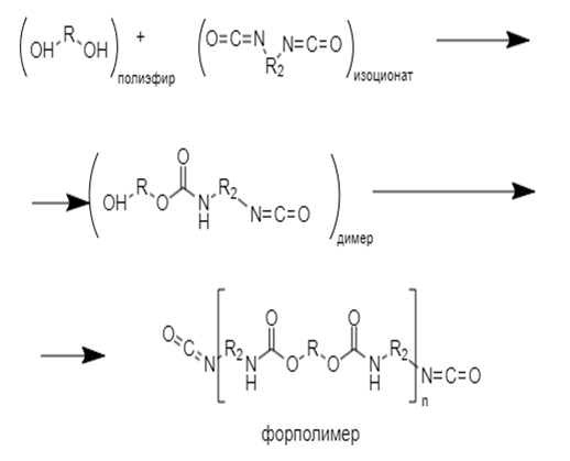 Реакция взаимодействия изоцианатов с ди- и полигидрокси содержащими соединениями протекает без образования промежуточных продуктов по ступенчатому механизму и происходит в результате миграции подвижного атома водорода гидроксильной группы к атому азота изоциановой группы. Далее свободные гидроксильные группы образовавшегося диуретана реагируют с изоцианатными группами молекул диизоцианата. Этот процесс продолжается до тех пор, пока в реакции не израсходуются какие-либо из групп. После окончания реакции преполимер будет представлять собой вязкую жидкость.